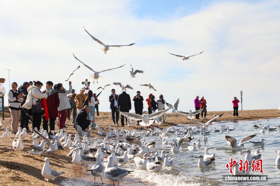 10月22日,青海省海南藏族自治州共和縣青海湖畔,游客與水鳥互動。中新社記者 馬銘言 攝