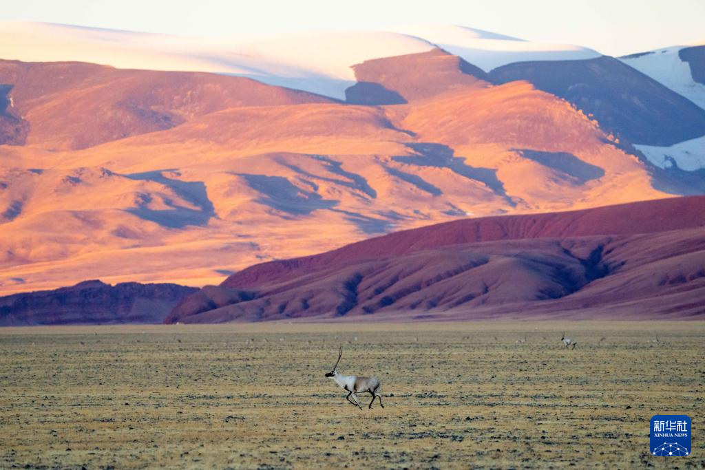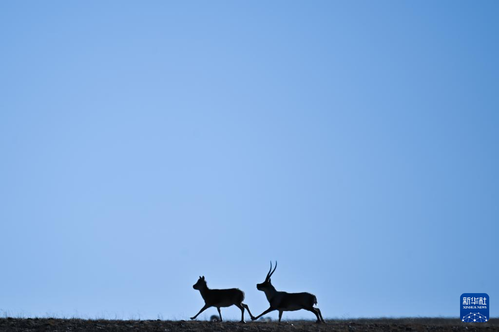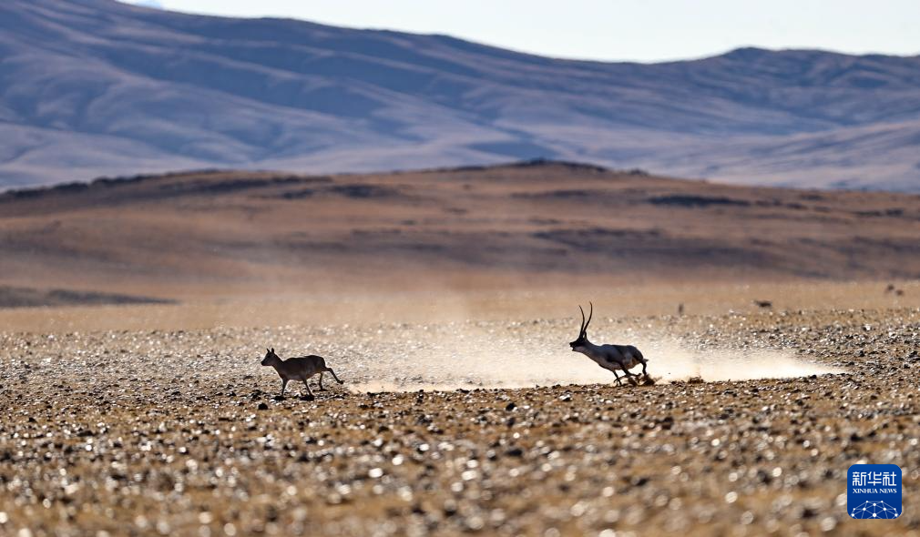 一頭雄性藏羚羊在羌塘國家級自然保護(hù)區(qū)的草原上追逐雌性藏羚羊(12月3日攝)。新華社記者 姜帆 攝