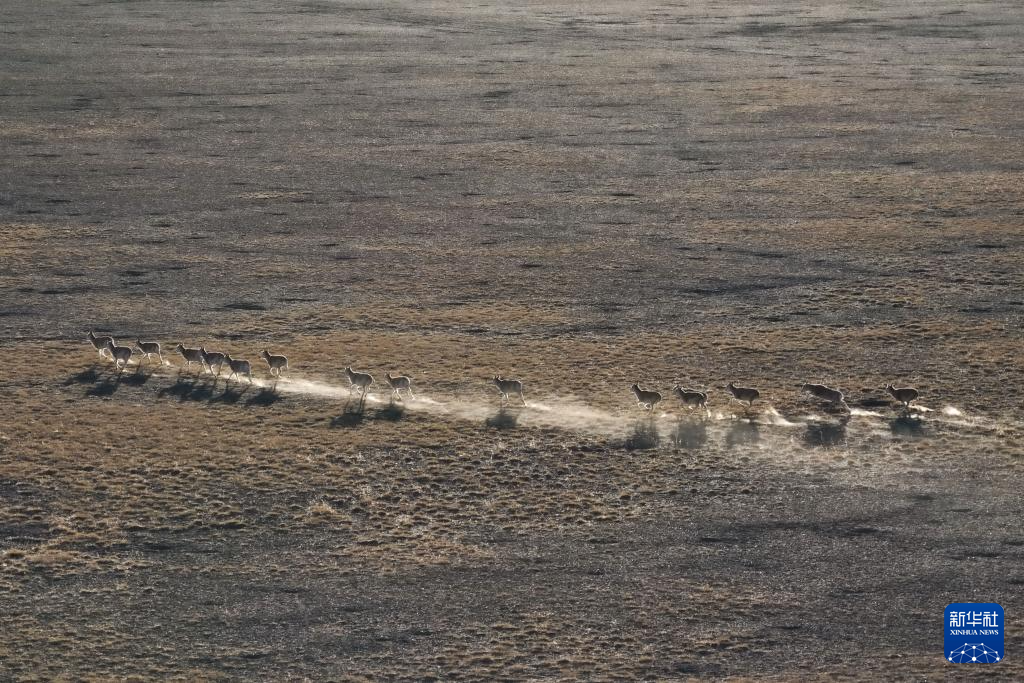 在阿爾金山國家級自然保護(hù)區(qū),一群藏羚羊在草原上奔跑(無人機照片,12月7日攝)。新華社記者 辛悅衛(wèi) 攝