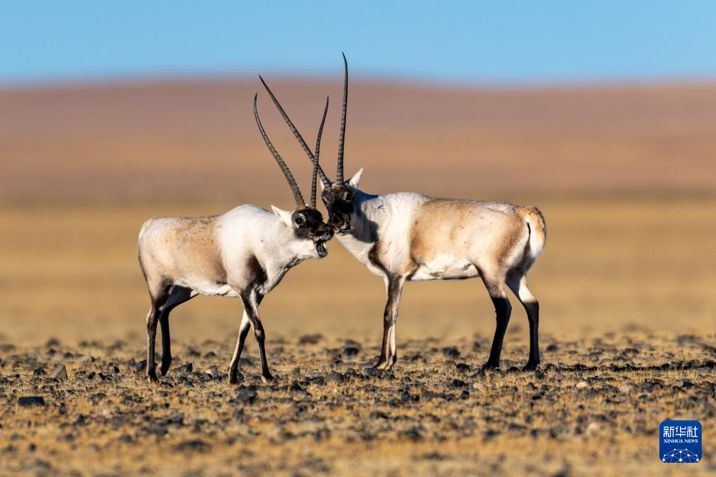 兩頭雄性藏羚羊在羌塘國家級自然保護(hù)區(qū)貼面嗥叫示威,準(zhǔn)備爭斗(12月1日攝)。新華社記者 郭昱 攝