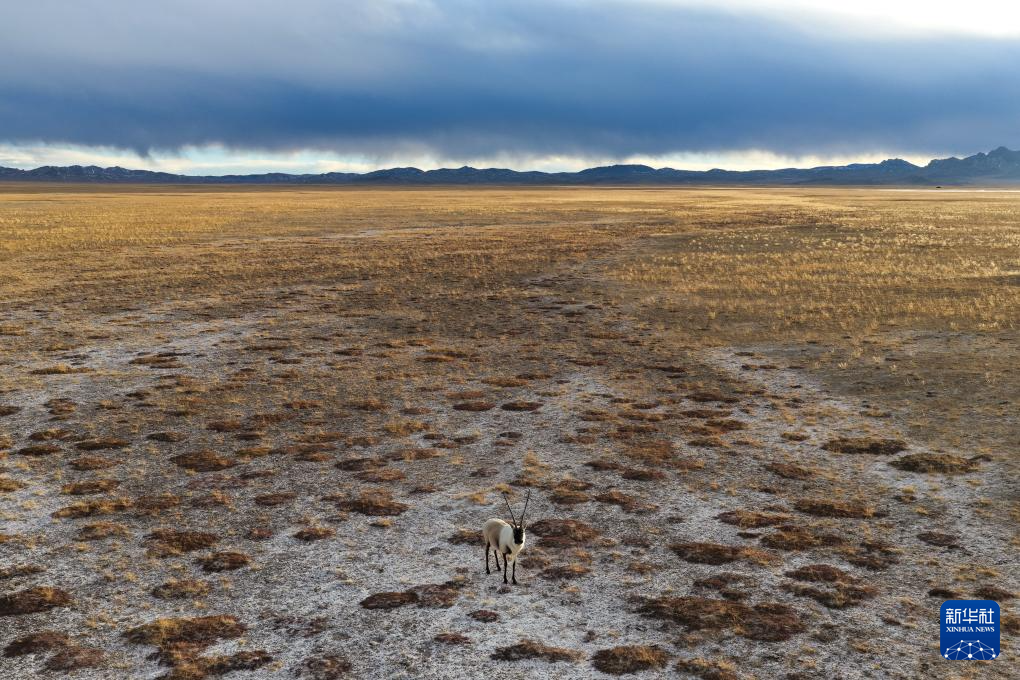 在阿爾金山國家級自然保護(hù)區(qū),一只雄性藏羚羊在覓食(12月5日攝,無人機照片)。新華社記者 辛悅衛(wèi) 攝