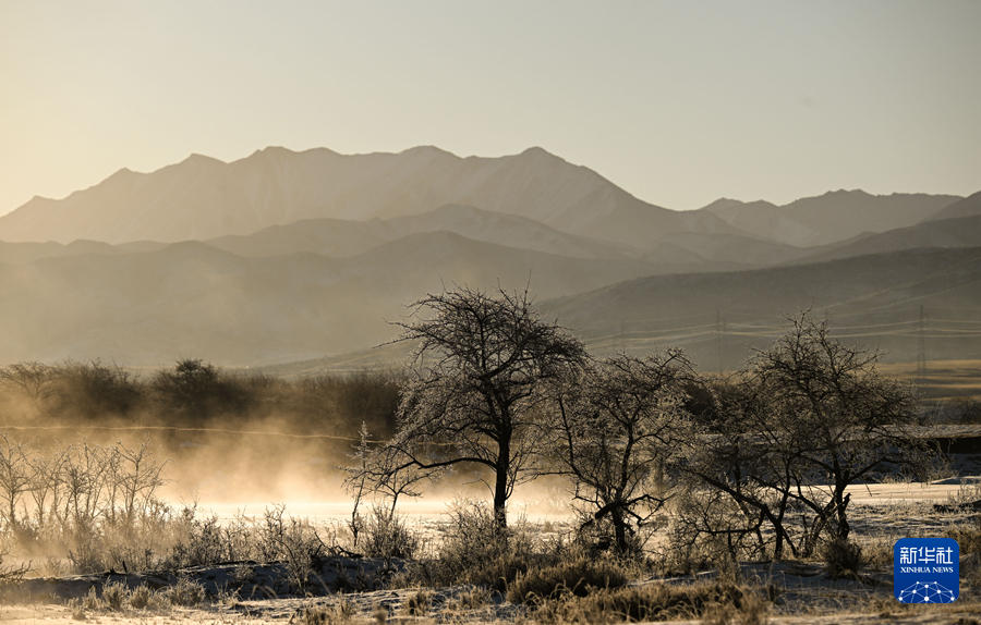冬日時節,青海省海北藏族自治州祁連縣出現霧凇景觀,與祁連山的日出相映成趣,美如畫卷。