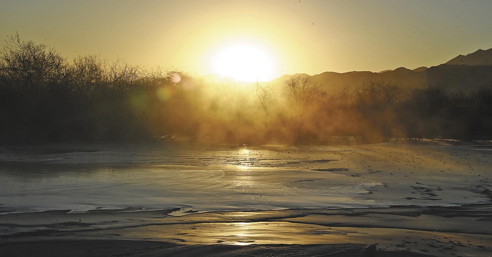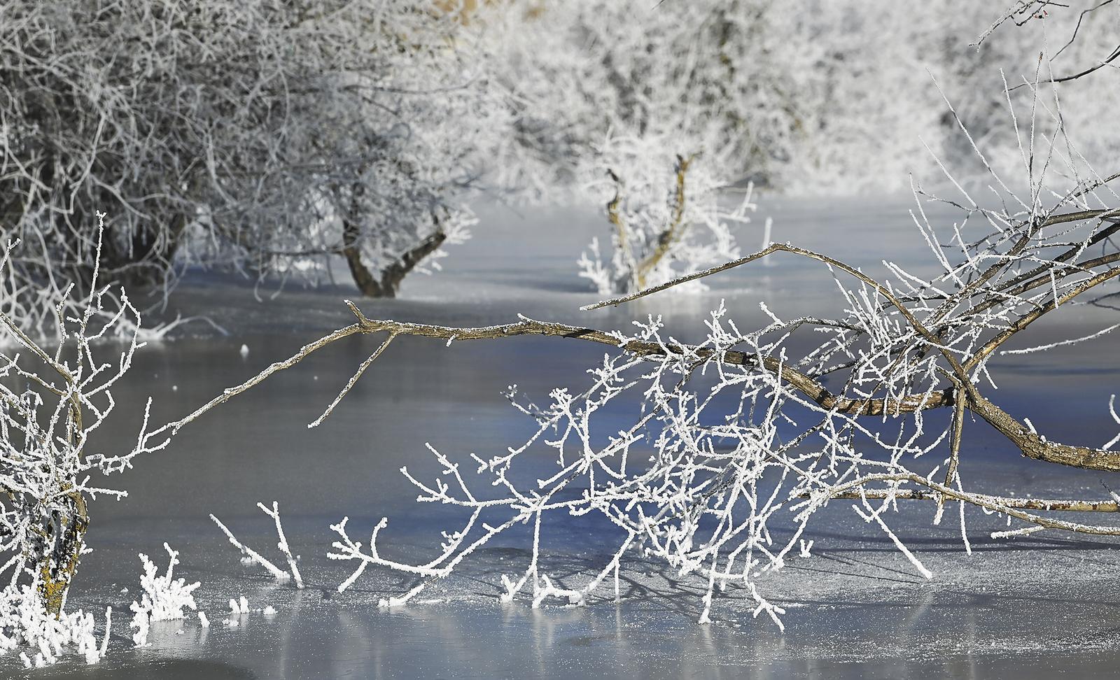 三九寒冬,清晨時(shí)分,未完全封凍的河谷蒸騰起氤氳水汽,在零下二十?dāng)z氏度以下的低溫中凝華,給樹枝裹上一層晶瑩剔透的冰晶。陽光穿透晨霧,冰晶折射出五彩光澤,與蜿蜒河流冰面、遠(yuǎn)處祁連雪峰相映成畫,漫步其間仿佛闖入童話世界。