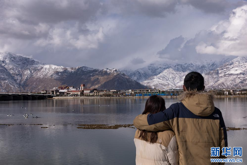 1月18日,游客在拉薩河邊觀賞雪景。新華網(wǎng)發(fā) 李騰 攝