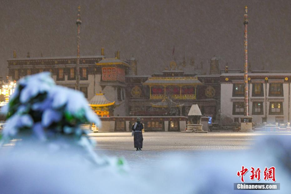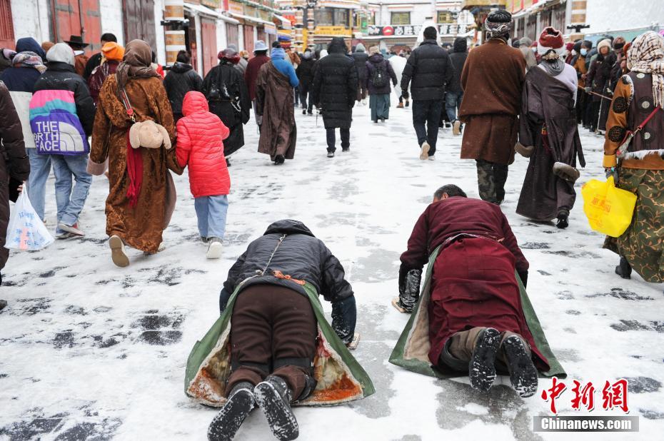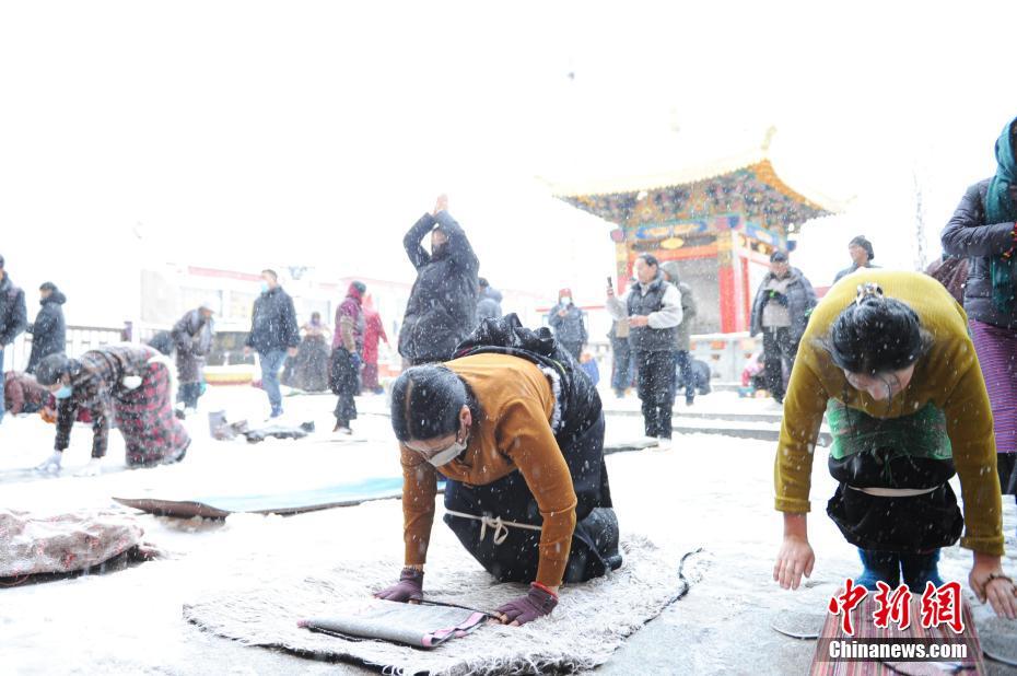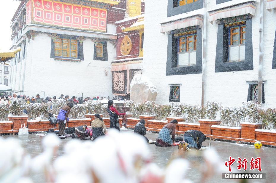 圖為雪后信眾在拉薩市大昭寺前朝拜。