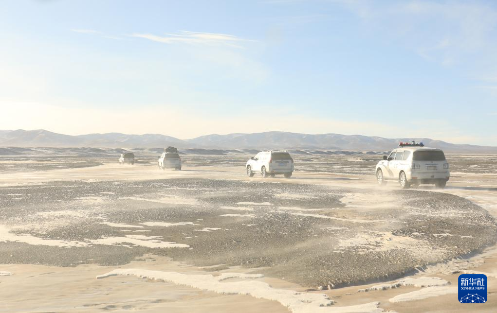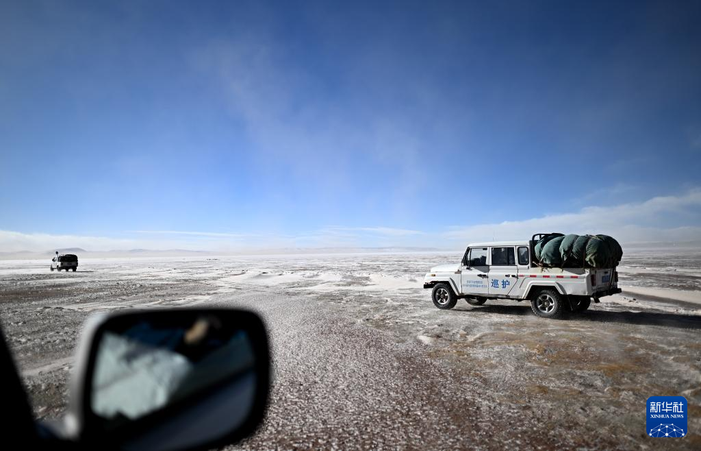 在可可西里卓乃湖區域附近,可可西里森林公安局巡山車輛在巡查途中(1月19日攝)。新華社記者 李占軼 攝