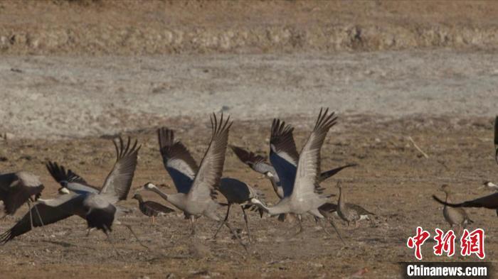 圖為灰鶴群在草地上嬉戲。仁增加措 攝