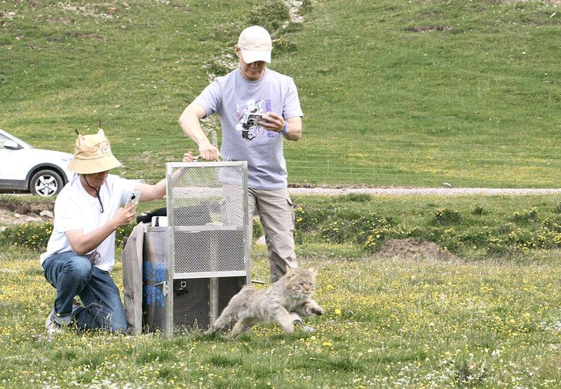 2023年7月23日,在青海省海北藏族自治州海晏縣,西寧野生動物園副園長齊新章(左一)和中國農業大學動物醫學院副院長金藝鵬放歸荒漠貓“黃太急”。(西寧野生動物園供圖)