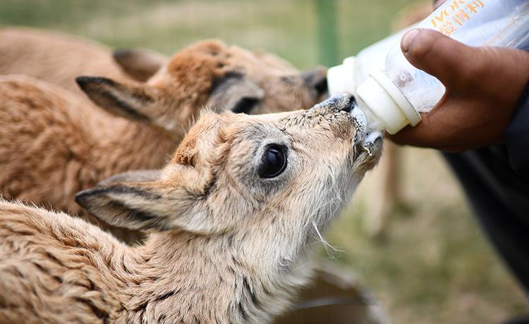 2023年7月28日,可可西里管理處索南達(dá)杰保護(hù)站隊(duì)員才仁多杰在給被救助的藏羚羊幼仔喂奶。(張宏祥 攝)