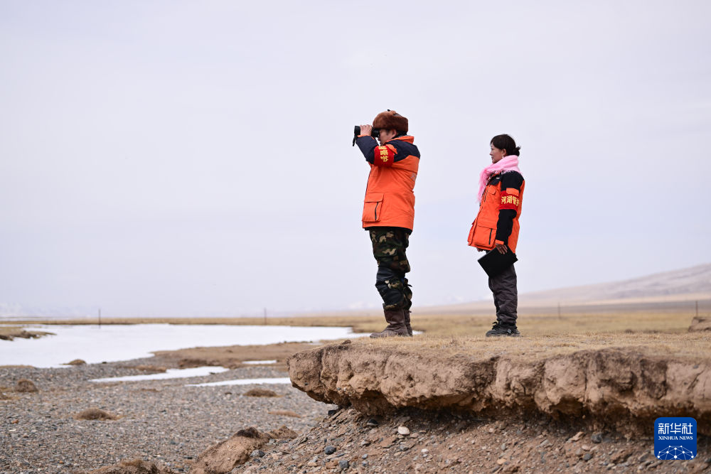 3月21日,葉金俄日(左)與東木措在青海省海北藏族自治州祁連縣的黑河流域巡護。新華社記者 張龍 攝