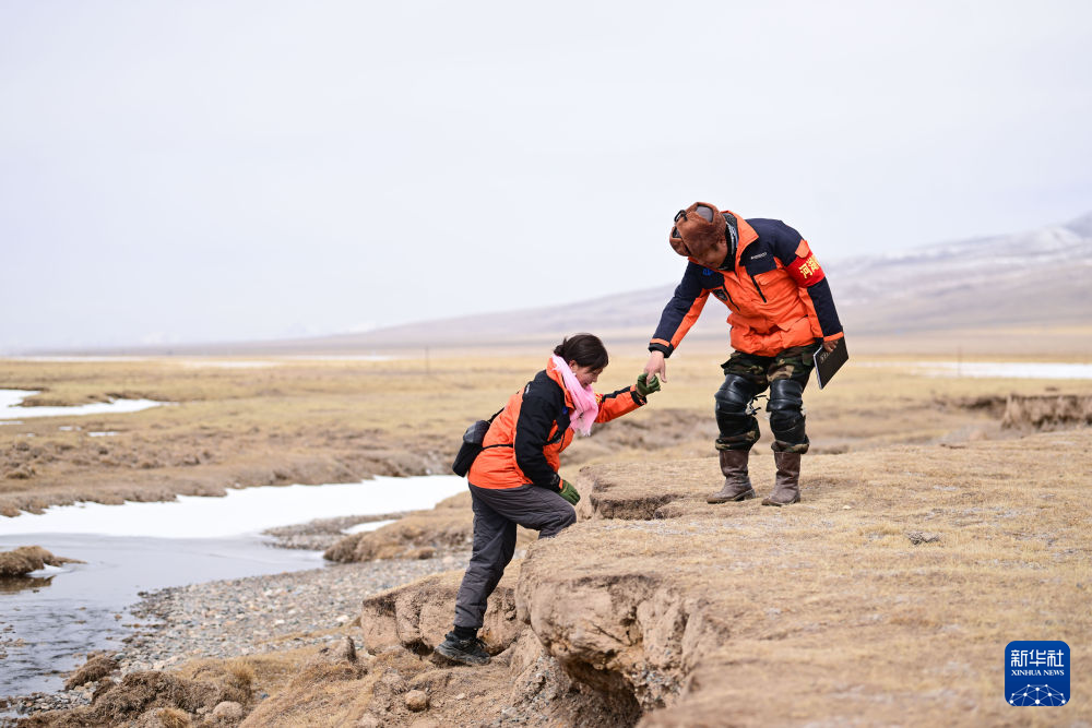3月21日,葉金俄日(右)在渡過冰河后等待妻子東木措。新華社記者 張龍 攝