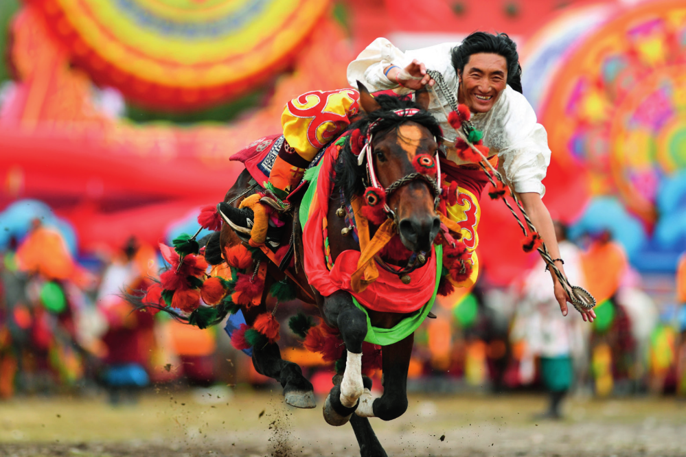 當地群眾在玉樹藏族自治州成立70周年慶祝大會上表演傳統賽馬(2021年8月4日攝)吳剛 攝刊