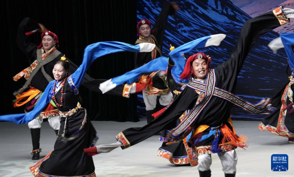 來(lái)自青海玉樹(shù)藏族自治州嶺格珠民間歌舞團(tuán)的農(nóng)牧民演員在表演民族團(tuán)結(jié)進(jìn)步短劇《唐蕃古道》(5月13日攝)。新華社記者 李欣 攝
