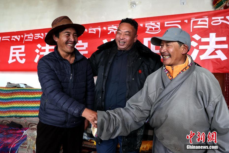 6月3日,在青海省果洛藏族自治州瑪多縣花石峽鎮,瑪多縣人民法院“馬背法庭”的法官在牧民家中完成訴前調解。薛蒂 攝