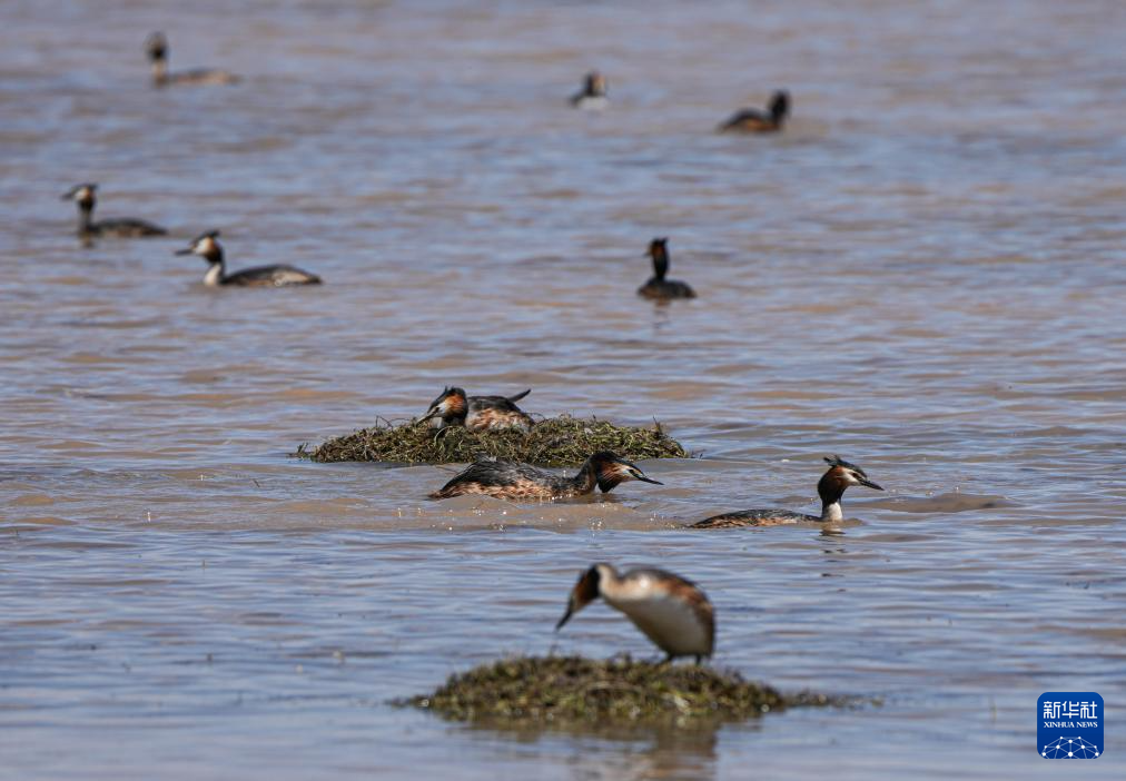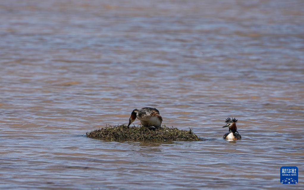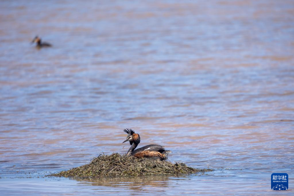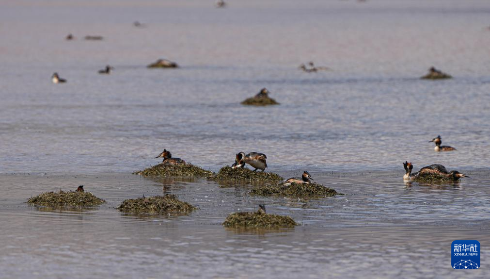 時值初夏,一群鳳頭鸊鷉在西藏自治區那曲市申扎縣下過鄉格仁錯旁邊的濕地營巢孵卵,準備迎接新生命的誕生。