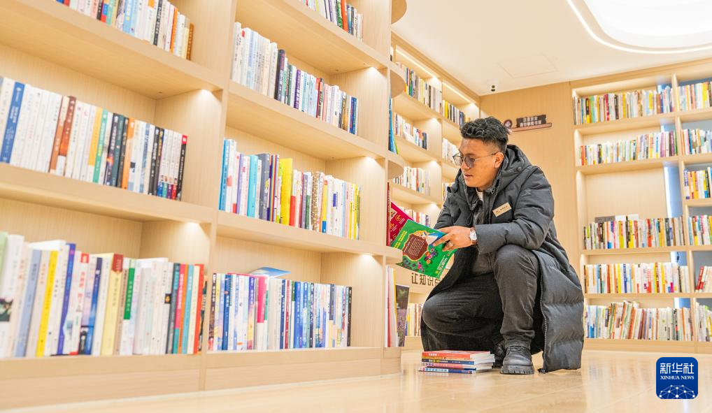 “溫暖嘉·色尼城市書房”管理員白瑪扎西正在整理書籍(6月17日攝)。新華社記者 丁增尼達 攝