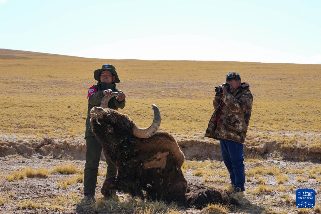 6月13日,羌塘國家級自然保護區野生動物專業管護隊員在檢查一頭野牦牛的尸體。新華社記者 旦增尼瑪曲珠 攝