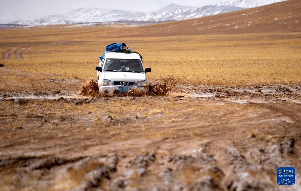 5月10日,野生動物專業管護隊員的車子在巡護路上穿越泥濘路段。新華社記者 姜帆 攝