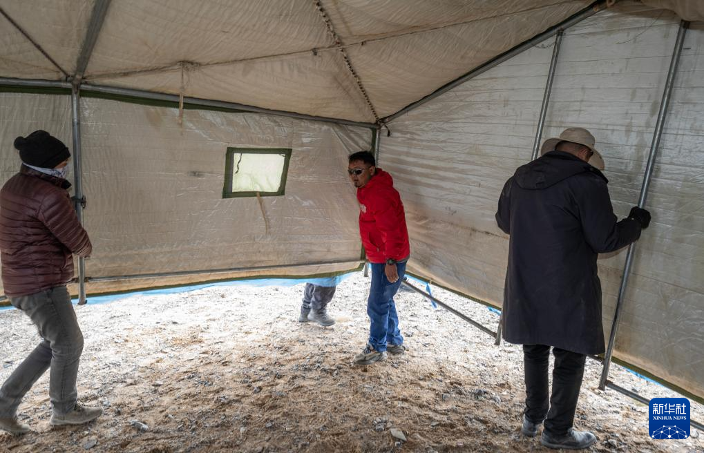 6月13日,格桑倫珠(中)、管護隊員和記者一起搭帳篷。新華社記者 費茂華 攝