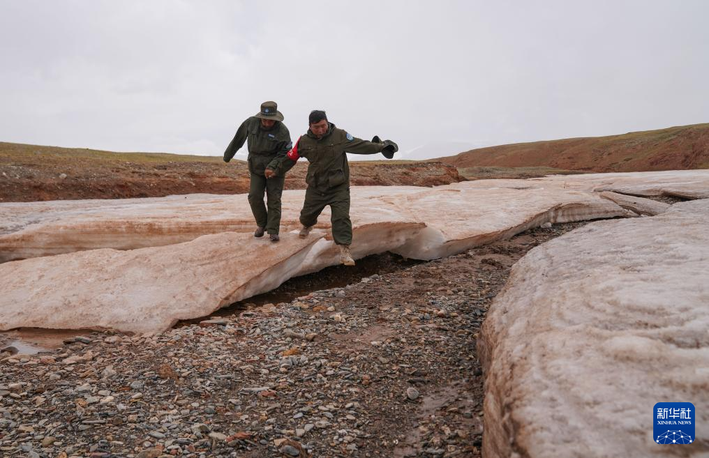 6月15日,羌塘國家級自然保護區野生動物專業管護隊員索朗(右)和羅布檢查河面冰凍情況。新華社記者 費茂華 攝