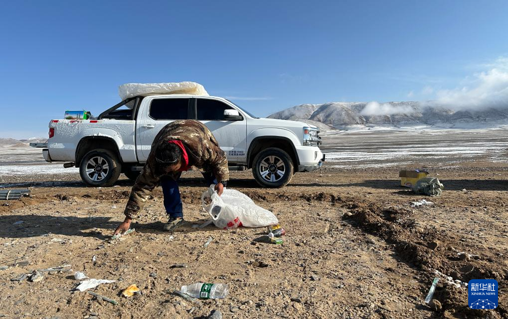 6月15日,格桑倫珠在撿拾宿營地的垃圾,準備裝車帶走。新華社記者 費茂華 攝