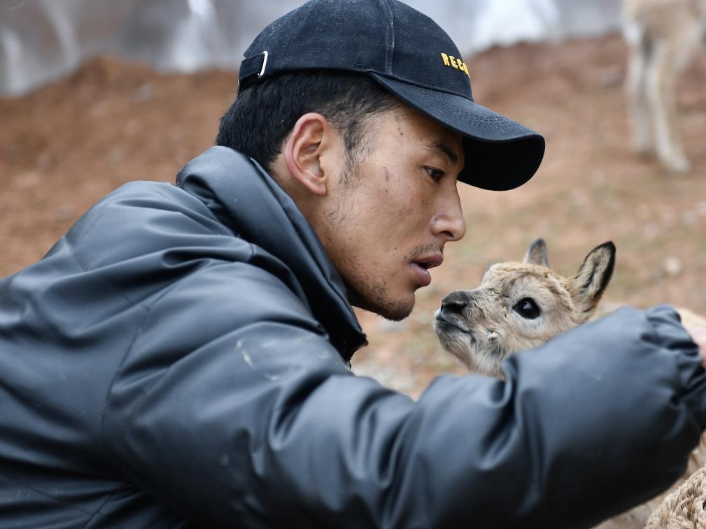 2020年7月7日,在可可西里卓乃湖保護站,保護隊員才文多杰照顧一只藏羚羊幼仔。新華社記者 張龍 攝