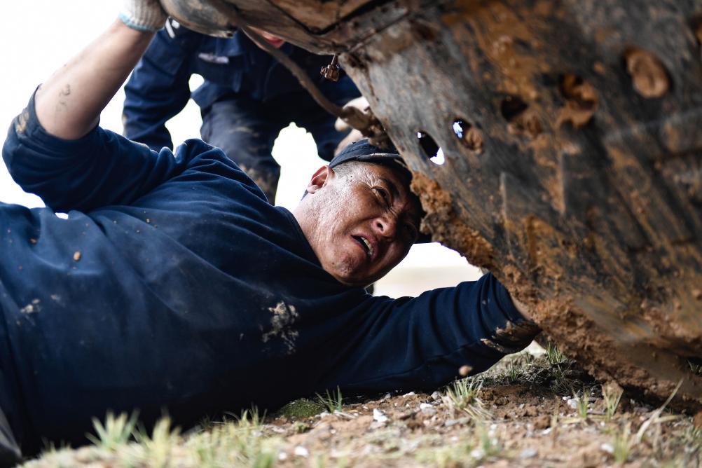 2020年7月6日,卓乃湖保護站站長秋培扎西在可可西里地區修理車輛。新華社記者 張龍 攝