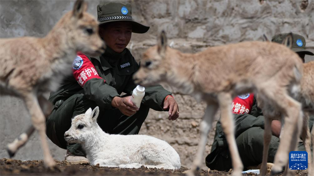 尼瑪縣措羅木管護站野保員在給白色藏羚羊幼崽喂奶(7月13日攝)。新華社發(旦增攝)
