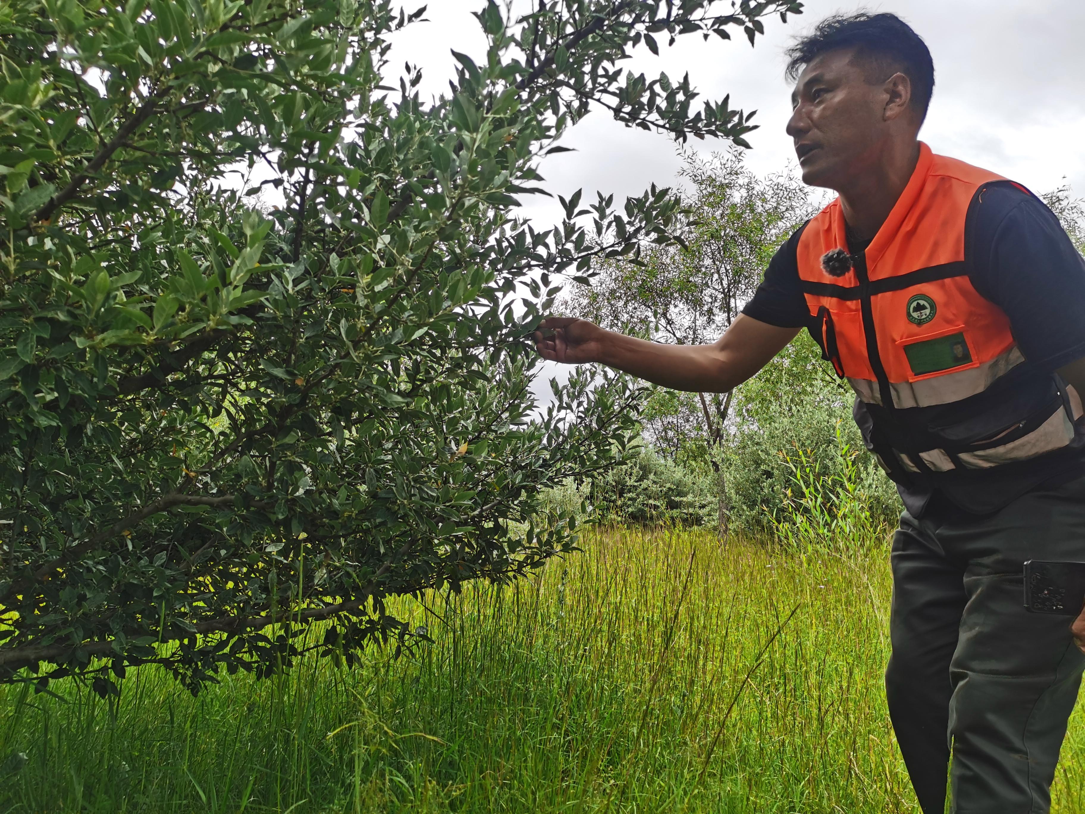 濕地管護員旺扎查看樹木生長情況 中國經濟網記者魏金金/攝