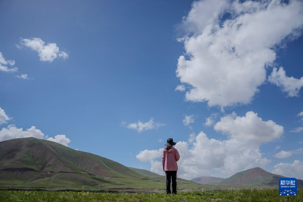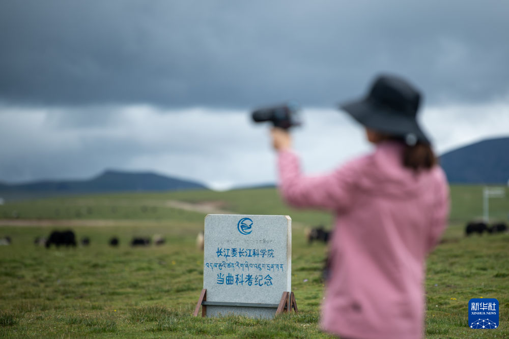 7月23日,長江科學(xué)院河流研究所的劉玉嬌站在聶洽曲的草灘上。新華社 杜笑微 攝
