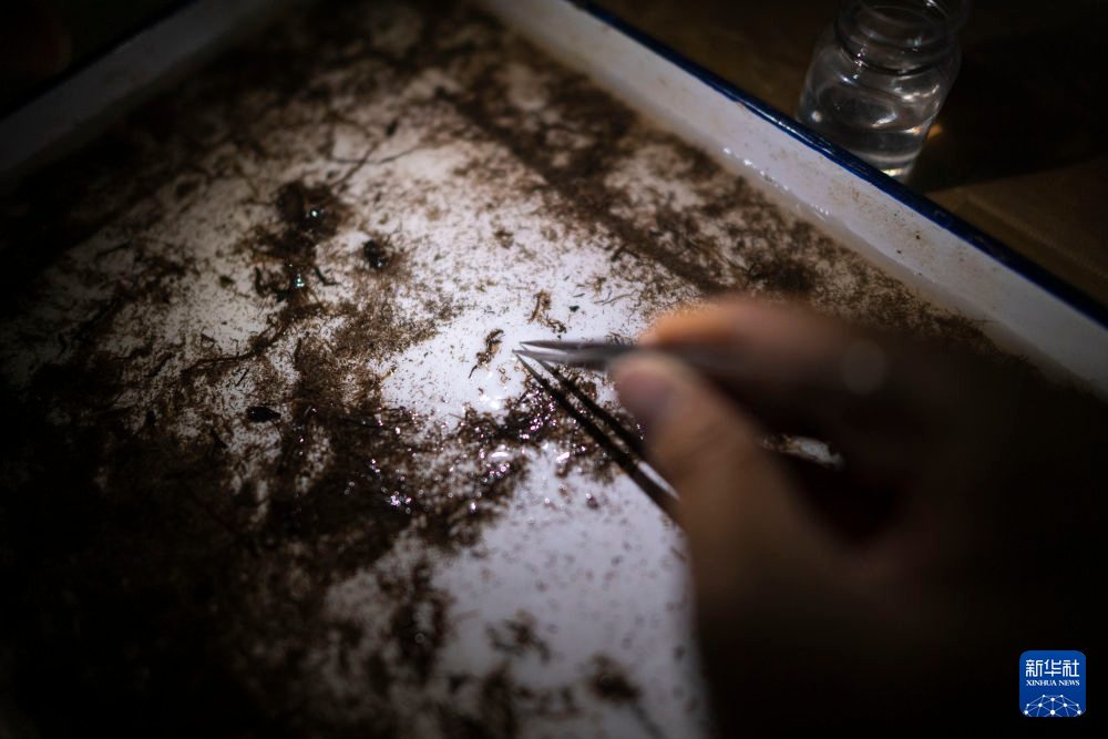 7月24日,在唐古拉山鎮住宿處,科考隊員連夜進行底棲生物挑揀。新華社記者 伍志尊 攝