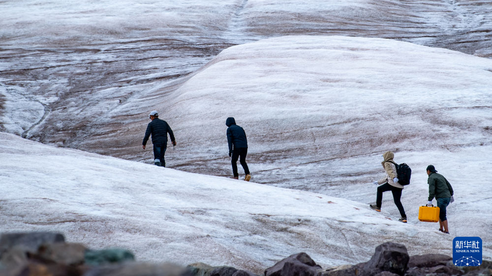 7月25日,在冬克瑪底冰川,科考隊員背負設備攀爬冰川。新華社發(杜笑微 攝)