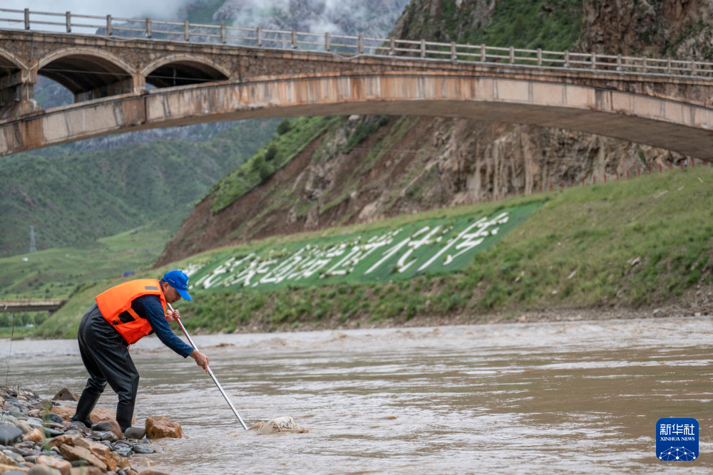 7月21日,在扎曲雜多河段,科考隊員在收集樣本。新華社發(杜笑微 攝)