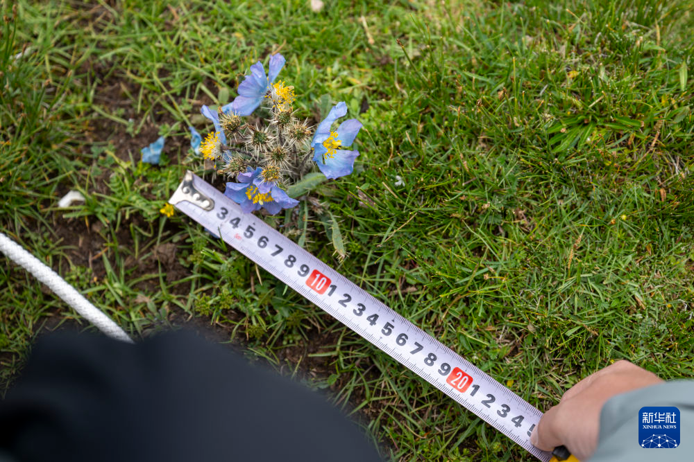 7月22日,在當曲源,科考隊員在測量樣方內的植物指標。新華社記者 伍志尊 攝