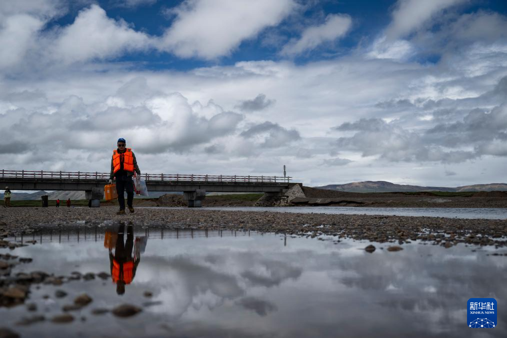 7月23日,科考隊員在治多聶洽曲進行地下水水位測量。新華社記者 潘彬彬 攝