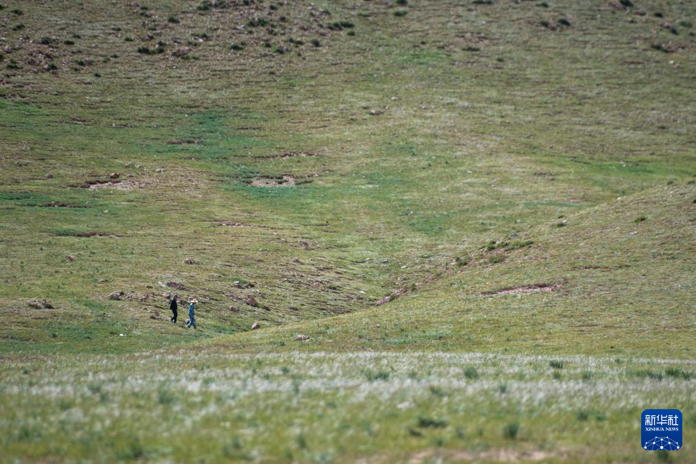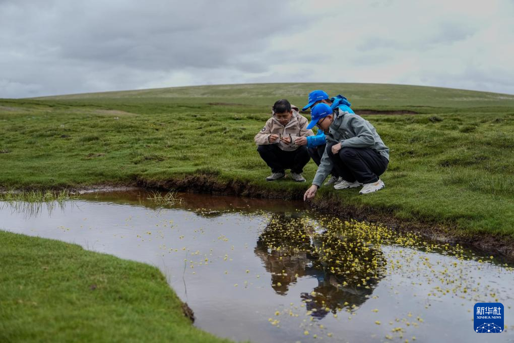 7月22日,在查旦濕地,科考隊員查看植被情況。新華社發(fā) 杜笑微 攝