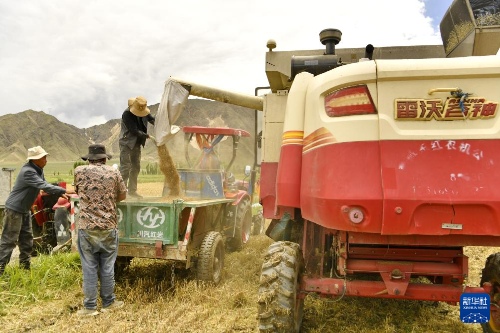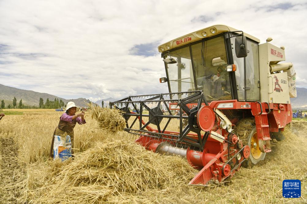 7月31日,聯合收割機在山南市扎囊縣扎其鄉朗賽嶺村的農田里作業。新華社記者 張汝鋒 攝