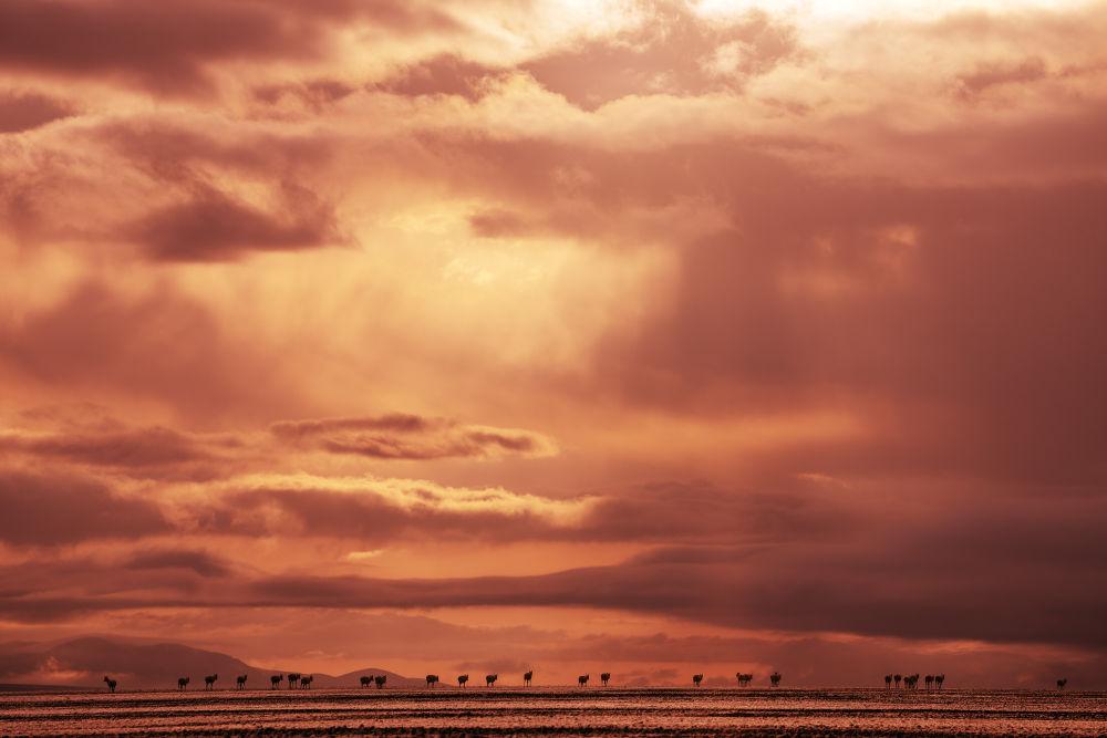 6月15日清晨雪后,在羌塘國(guó)家級(jí)自然保護(hù)區(qū),迎著朝霞前行在遷徙路上的一群藏羚羊。新華社記者 費(fèi)茂華 攝