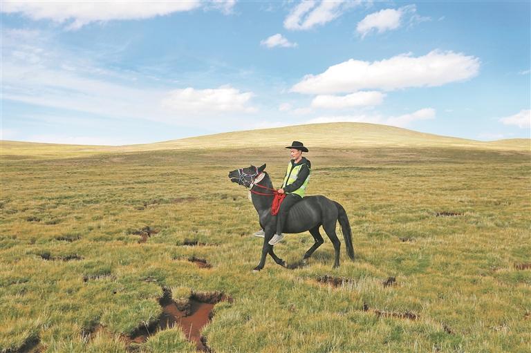 自三江源國家公園試點至正式設(shè)立,班成日復(fù)一日履行著放牧與巡護(hù)的雙重職責(zé)。他每天騎馬深入濕地草原,清理垃圾、監(jiān)測動物、制止盜獵。