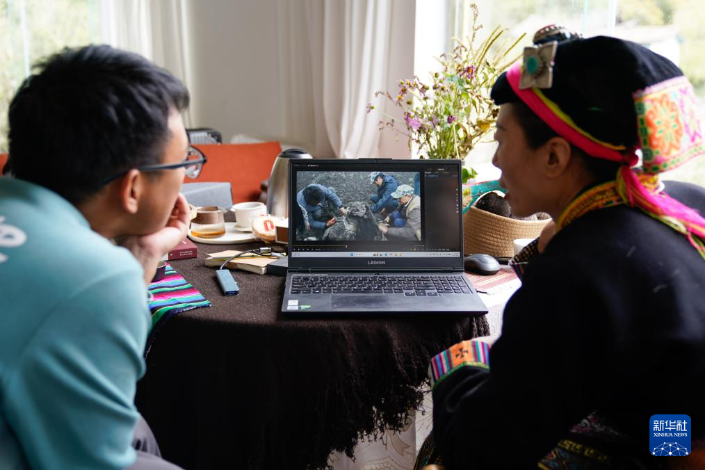 10月8日,能卡曼(右)給在磽磧藏族鄉進行調研的研究生盧俊糖展示她拍攝的當地群眾剪牦牛毛的視頻。新華社記者 胥冰潔 攝