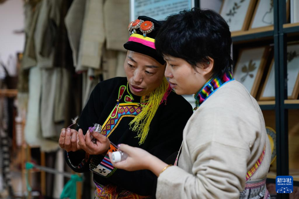 10月7日,能卡曼(左)在工作室里為游客介紹磽磧花腰帶編織技藝。新華社記者 胥冰潔 攝