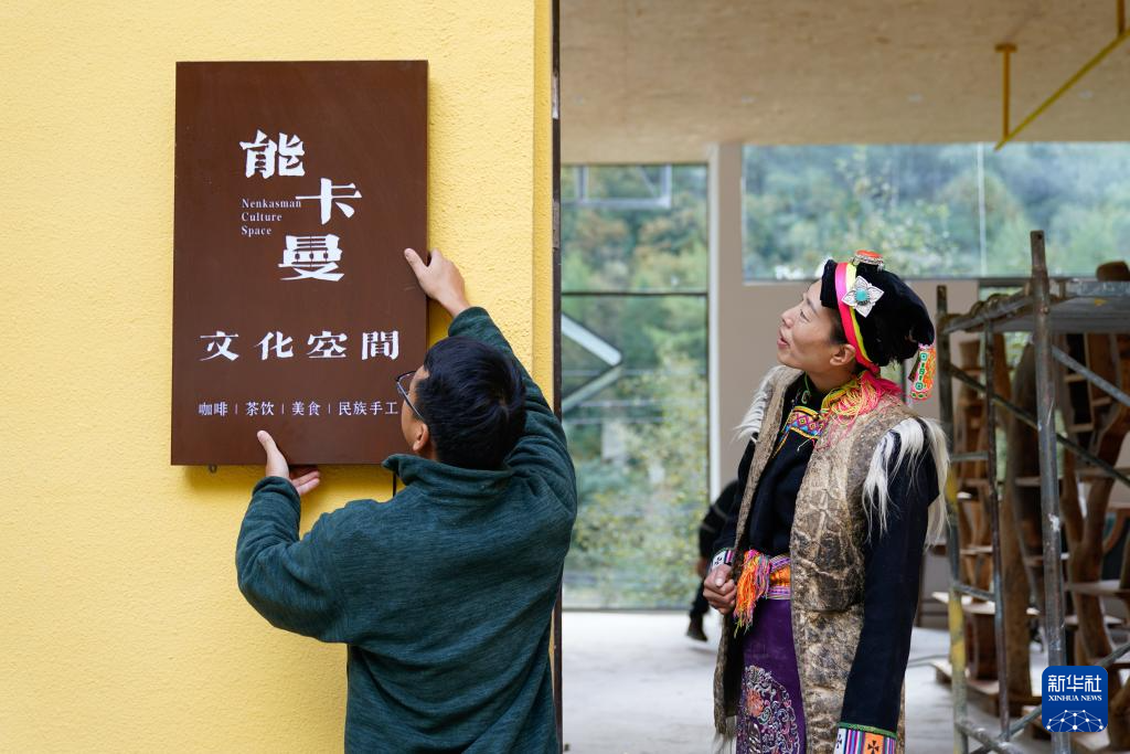 10月8日,能卡曼(右)和在磽磧藏族鄉進行調研的研究生盧俊糖裝飾即將完工的文化空間。新華社記者 胥冰潔 攝
