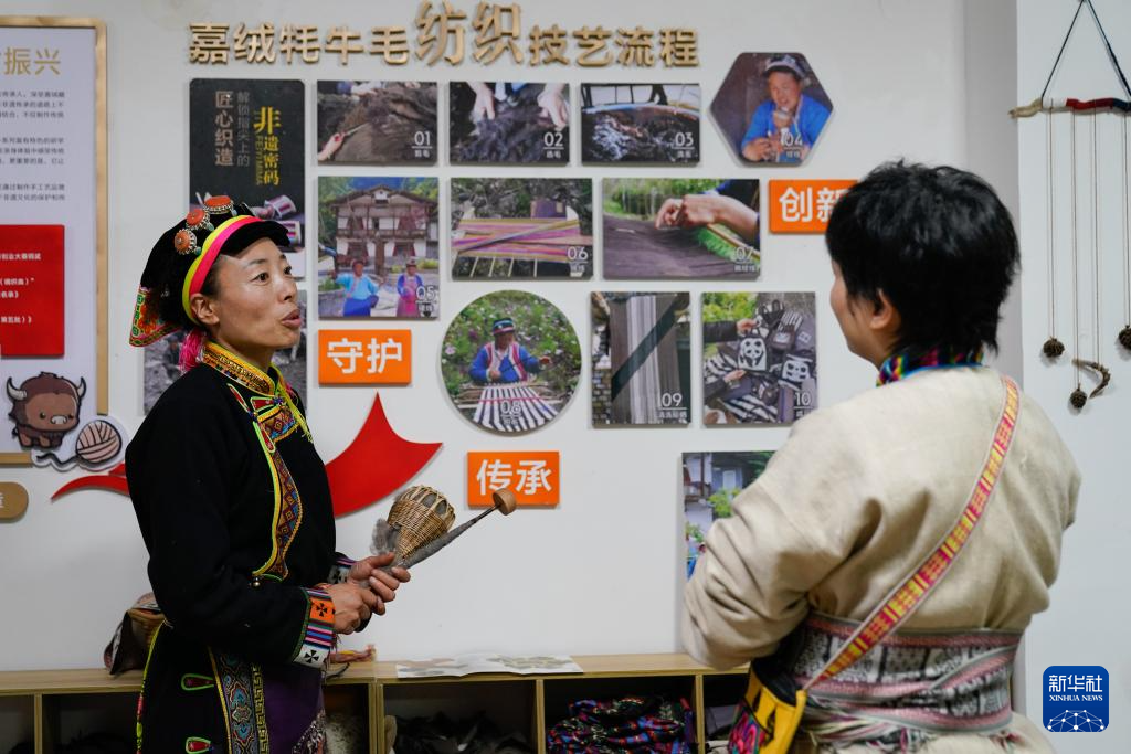10月7日,能卡曼(左)在工作室為游客介紹牦牛毛紡織技藝流程。新華社記者 胥冰潔 攝
