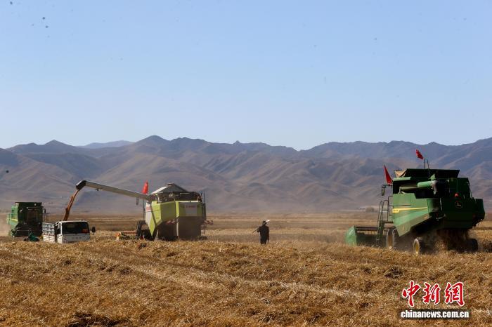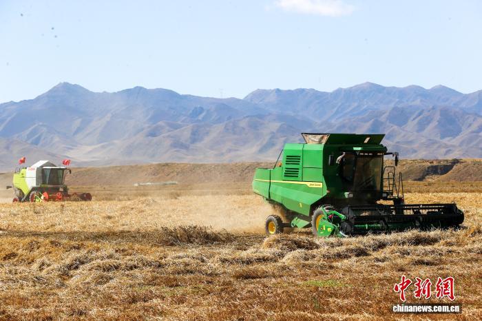 中國藏族網通訊 10月15日,青海省海南藏族自治州貴南縣種植的萬畝小麥進入收割季。近年來,該縣推廣優良品種與機械化作業,為秋糧穩產豐收提供了堅實保障。