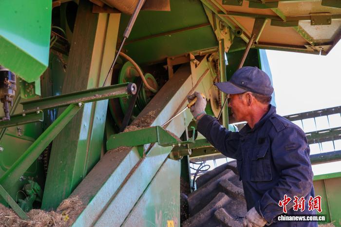 圖為農民清理收割機內的麥稈和雜草。中新社記者 薛蒂 攝
