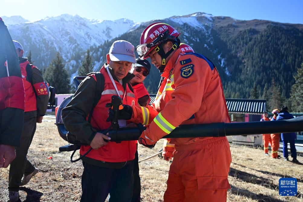 11月8日,在青海省海北藏族自治州祁連縣阿咪東索林區,祁連縣消防救援大隊消防員(右一)指導當地護林員使用森林草原滅火救援裝備。新華社記者 齊芷玥 攝