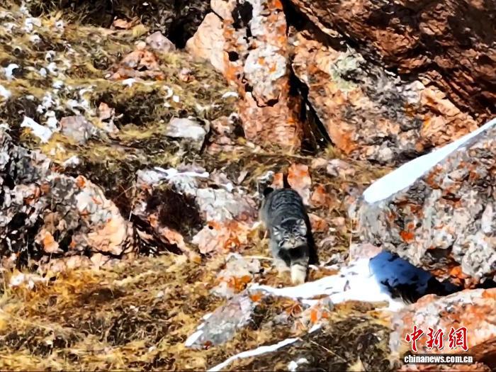 圖為兔猻在巖石間“梳洗”。陳天貴 攝