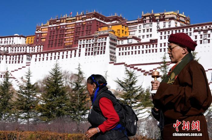 1月23日,西藏拉薩布達拉宮腳下,信眾手持轉經筒轉經。冬季高原進入農閑期,眾多藏傳佛教信眾從各地來到拉薩,沿布達拉宮、大昭寺等地轉經、朝拜、祈福。中新社記者 李林 攝