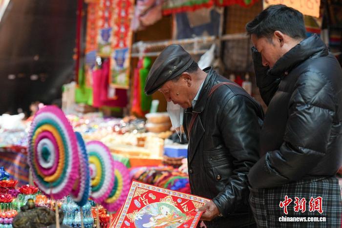 1月27日,藏歷新年將至,拉薩街頭年味漸濃。城區街巷燈籠高掛,市民忙著采購酥油花、香布、切瑪盒、吉祥羊頭、藏文春聯等特色年貨,各式新年好物琳瑯滿目,處處洋溢著喜慶祥和的節日氛圍,人們以傳統方式迎接新年到來。圖為市民在八廓商城選購年貨。貢確 攝