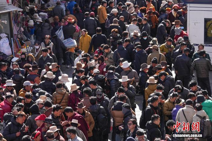 1月27日,藏歷新年將至,拉薩街頭年味漸濃。城區街巷燈籠高掛,市民忙著采購酥油花、香布、切瑪盒、吉祥羊頭、藏文春聯等特色年貨,各式新年好物琳瑯滿目,處處洋溢著喜慶祥和的節日氛圍,人們以傳統方式迎接新年到來。圖為拉薩沖賽康市場前來選購年貨的民眾絡繹不絕。貢確 攝